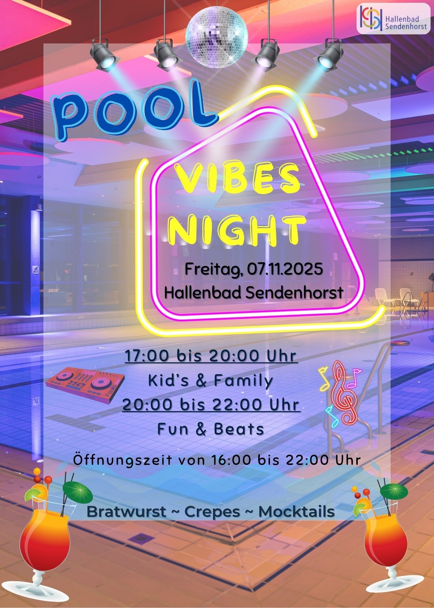 Am Freitag, den 07.11.2025 findet ab 17:00 Uhr die erste Pool Vibes - Night im Sendenhorster Hallenbad statt. Neben cooler Musik & neuen Lichteffekten sind Bratwurst vom Grill, Crêpes & leckere Drinks mit an Bord. Eintauchen zum regulären Eintrittspreis in einen Abend voller Spaß & Fun im warmen Hallenbad. Ganz gleich ob planschen, tanzen oder einfach den Aufenthalt genießen – hier ist für jeden etwas dabei. Geöffnet hat das Hallenbad an diesem Nachmittag ab 16:00 Uhr. Von 17:00 bis 20:00 Uhr ist Kids & Family Time für die ganze Familie angesagt. Von 20:00 bis 22:00 Uhr verwandelt sich das Hallenbad in eine einzigartige Clubatmosphäre – Fun & Beats, das Bäderteam hat in neue Licht- und Musiktechnik investiert, man darf also gespannt sein! Mocktails werden an der Poolbar im Eingangsbereich vom Team des Hallenbades angeboten. Es wird nass und unvergesslich, das Team freut sich auf zahlreiche Besucherinnen und Besucher!