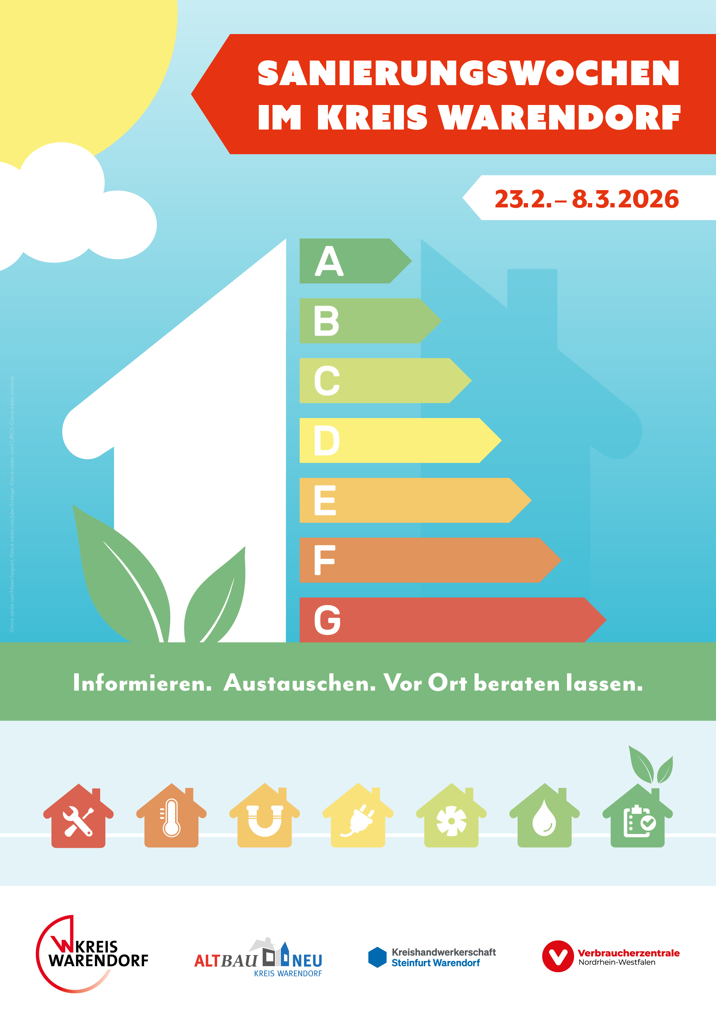 Gemeinsam bieten der Kreis Warendorf sowie die Städte und Gemeinden im Kreis vom 23. Februar bis zum 8. März die „Sanierungswochen im Kreis Warendorf 2026“ an. Die Aktionstage werden von der Kreishandwerkerschaft Steinfurt-Warendorf und der Verbraucherzentrale NRW unterstützt. In zahlreichen Fachveranstaltungen können sich interessierte Eigentümerinnen und Eigentümer von Wohnimmobilien im Kreis Warendorf vor Ort und digital umfassend über das Thema Gebäudesanierung informieren. Das Themenspektrum reicht dabei vom Heizungstausch über Fassadenbegrünung bis hin zum Einbruchschutz. Das vollständige Programm ist online unter Protected link to alt-bau-neu.de einsehbar.